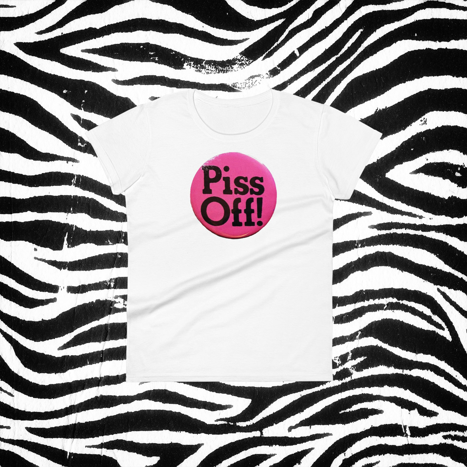 Under Heaven girls' graphic tee featuring a vintage-style pink pin with bold 'Piss Off!' text, perfect for a bratty, rebellious attitude. Edgy streetwear with a playful twist, combining retro vibes and bold statements for confident, unapologetic style.
